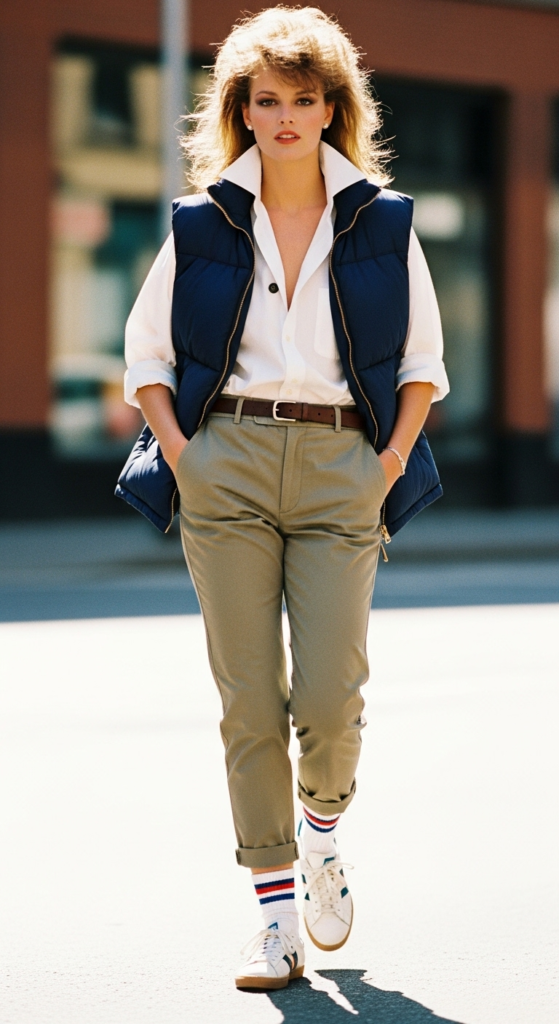 A classic white button-up shirt is the foundation of this preppy look, layered with a navy blue puffer vest and paired with tailored chinos. The vest’s quilted texture adds depth, while the crisp shirt maintains a polished appearance. This combination results in a smart-casual outfit that is both comfortable and sophisticated, suitable for various occasions.