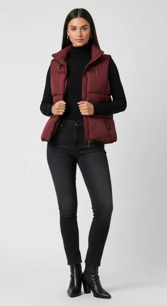 A fitted black turtleneck lays the foundation for this classic ensemble, paired with a tailored puffer vest in a rich burgundy hue. The combination of the turtleneck and the vest creates a sophisticated layering effect, while the sleek silhouette highlights the figure. This outfit is perfect for those cooler days when you want to look polished yet feel cozy.