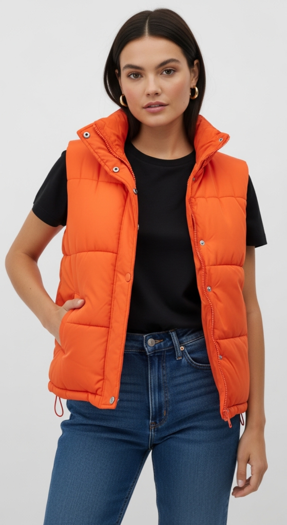 In this outfit, a vibrant orange puffer vest is layered over a simple black t-shirt, paired with dark wash jeans. The bold color of the vest stands out, making the outfit pop, while the simplicity of the t-shirt and jeans keeps the look grounded. This combination is perfect for adding a cheerful touch to your fall wardrobe, bringing warmth and brightness to the season.