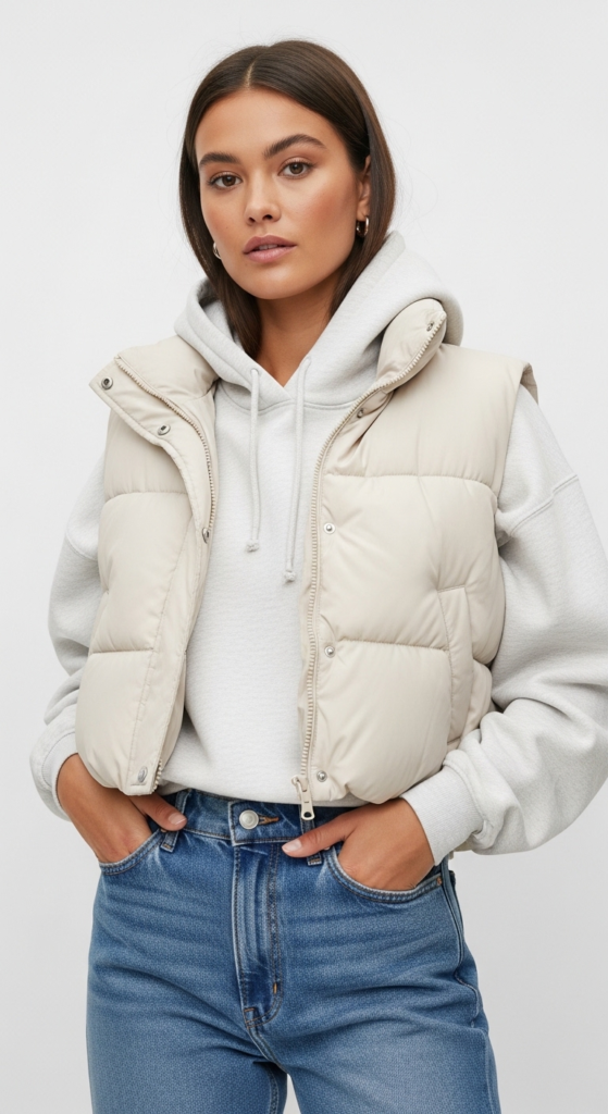 A cozy hoodie serves as the base for this laid-back outfit, topped with a lightweight puffer vest in a soft cream shade. Paired with high-waisted denim jeans, this look is all about comfort and relaxation. The combination of the hoodie’s casual vibe and the vest’s structured silhouette creates a stylish yet effortless ensemble for everyday wear.
