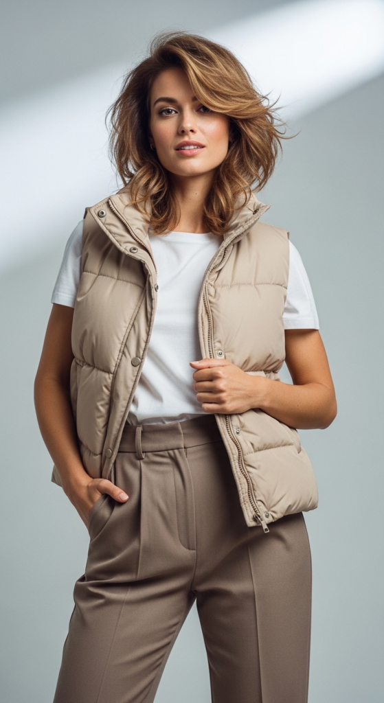An elegant approach to layering, this outfit features a beige puffer vest over a simple white t-shirt and taupe trousers. The neutral color palette creates a sophisticated look that is both calming and chic. The minimalist style highlights the clean lines and structured fit, making it ideal for those who appreciate understated elegance.