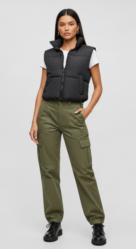 This outfit features olive green cargo pants paired with a fitted black puffer vest and a basic white tee. The cargo pants’ utilitarian style contrasts with the sleek design of the vest, creating an effortlessly cool urban look. The practicality of the cargo pockets combined with the warmth of the vest makes this ensemble both functional and stylish.