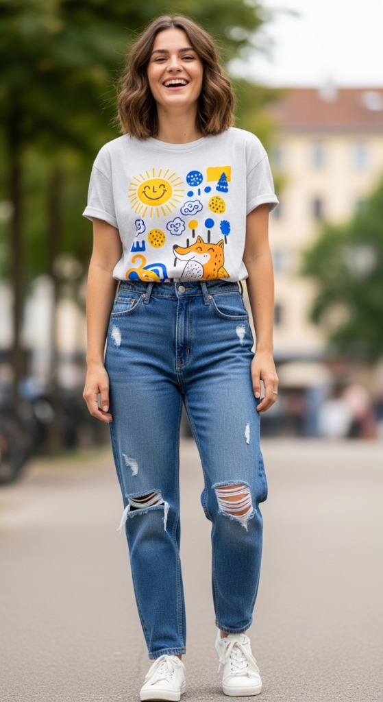 A quirky graphic tee takes center stage in this outfit, adorned with playful illustrations that showcase your personality. The tee is crafted from soft, breathable cotton, ensuring all-day comfort. Pair it with high-waisted, distressed jeans that offer a relaxed fit, creating a laid-back yet stylish silhouette that is perfect for expressing individuality.