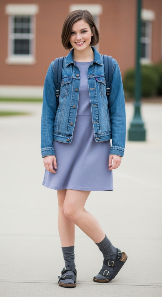 To complete the ensemble, wear a simple, solid-colored dress or a skirt that allows the socks and sandals to shine. Consider adding a denim jacket for a layered look that keeps you cozy during cooler school days. This quirky outfit is perfect for expressing your uniqueness while remaining comfortable throughout your busy schedule.