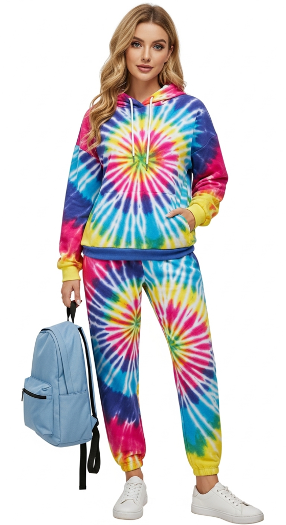 For styling, keep it casual with classic white sneakers, allowing the tie-dye to take center stage. A simple backpack in a solid color can provide a practical touch without detracting from the ensemble’s fun energy. This outfit is perfect for casual school days or lounging with friends, embodying a laid-back and creative spirit.