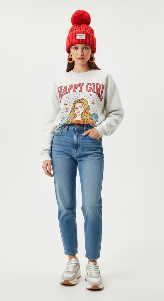 This ensemble showcases an oversized knitted beanie in a bold color paired with a graphic sweatshirt and high-waisted mom jeans. The beanie adds a fun and quirky element, while the sweatshirt, made from soft cotton, offers a cozy, relaxed fit. The mom jeans provide a vintage-inspired silhouette that balances the outfit beautifully.