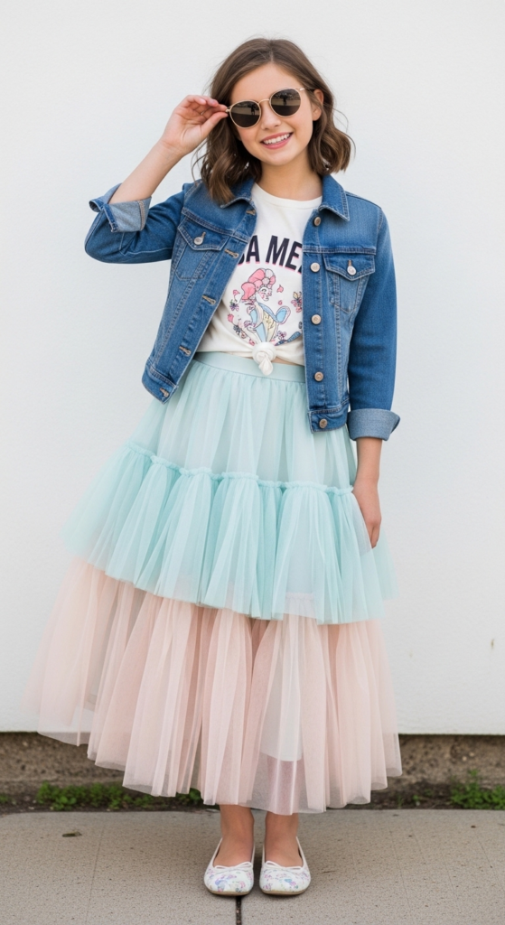 The Layered Tulle Skirt is a whimsical piece that features multiple layers of soft tulle in pastel shades, creating a dreamy, ethereal silhouette. The skirt’s voluminous nature adds a playful touch, while a fitted graphic tee balances the proportions, allowing for a fun yet stylish look that stands out.
