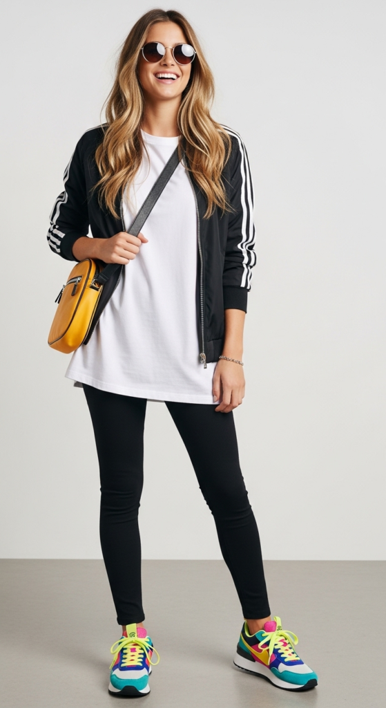 This outfit centers around a pair of vibrant, color-blocked sneakers that serve as the focal point. They feature a mix of bright colors and textures, paired with simple black leggings and an oversized white tee for a balanced look. The fitted leggings create a sleek silhouette that highlights the playful footwear.
