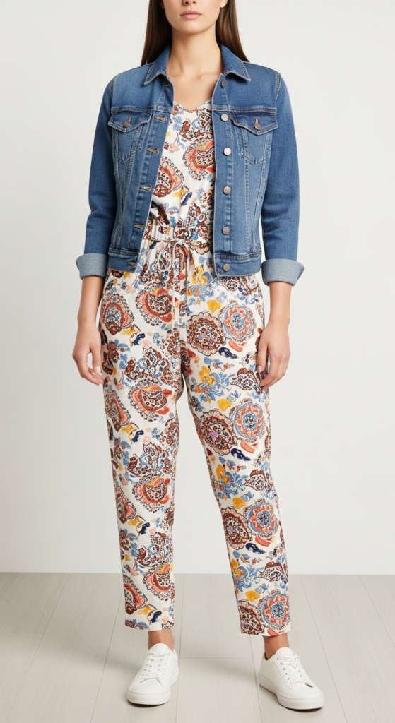 To complete the outfit, wear white sneakers or block-heeled sandals for a comfortable yet chic touch. A denim jacket can be layered over the jumpsuit for a practical option during cooler days. This ensemble is perfect for school or weekend outings, offering a stylish yet effortless choice for any occasion.