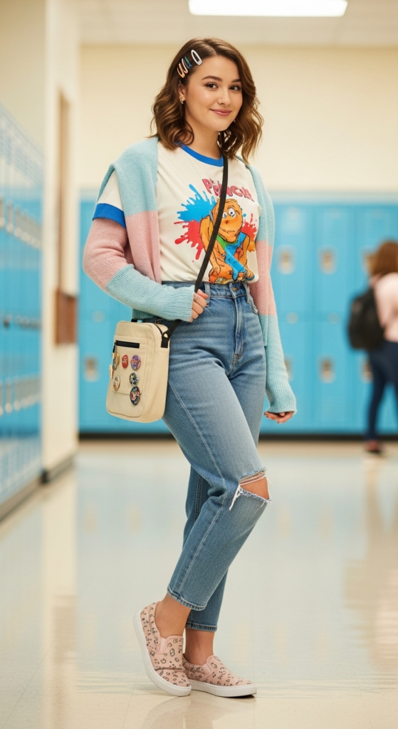 To style this look, wear comfortable slip-on shoes or trendy sneakers that complement the playful vibe. A light cardigan can be added for warmth, making this outfit ideal for varying temperatures. This ensemble is perfect for expressing individuality and creativity on casual school days.