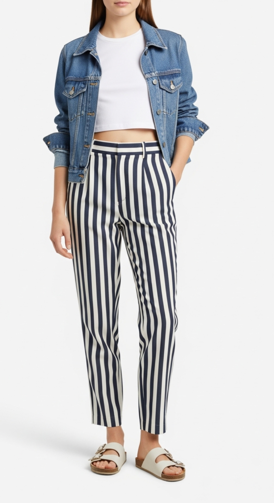 The Striped Trousers offer a fresh take on classic bottoms, featuring bold vertical stripes in contrasting colors. The trousers are tailored for a relaxed fit, allowing for comfort while making a statement. Pair them with a fitted white tee or a crop top to create a balanced silhouette that draws attention to the stripes.