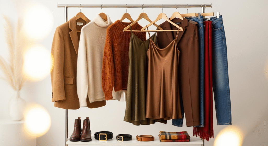 Chocolate adds depth. Cream offers softness and light. Earthy tones bring seasonal richness—rust gives glow, olive feels stable, burgundy adds drama. These hues echo falling leaves and warm spices, so outfits align naturally with the day’s atmosphere. Shades pair easily with each other, so coordinating pieces becomes effortless.